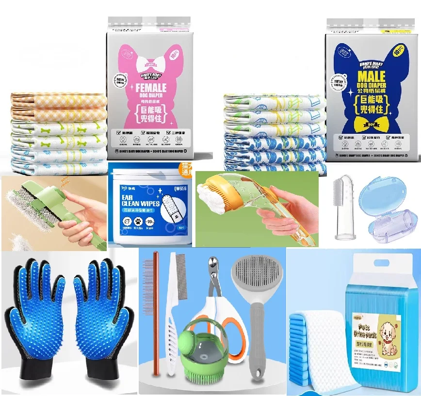 Complete set of pet cleaning supplies: wet wipes, diapers, combs, towels, suitable for cats and dogs
